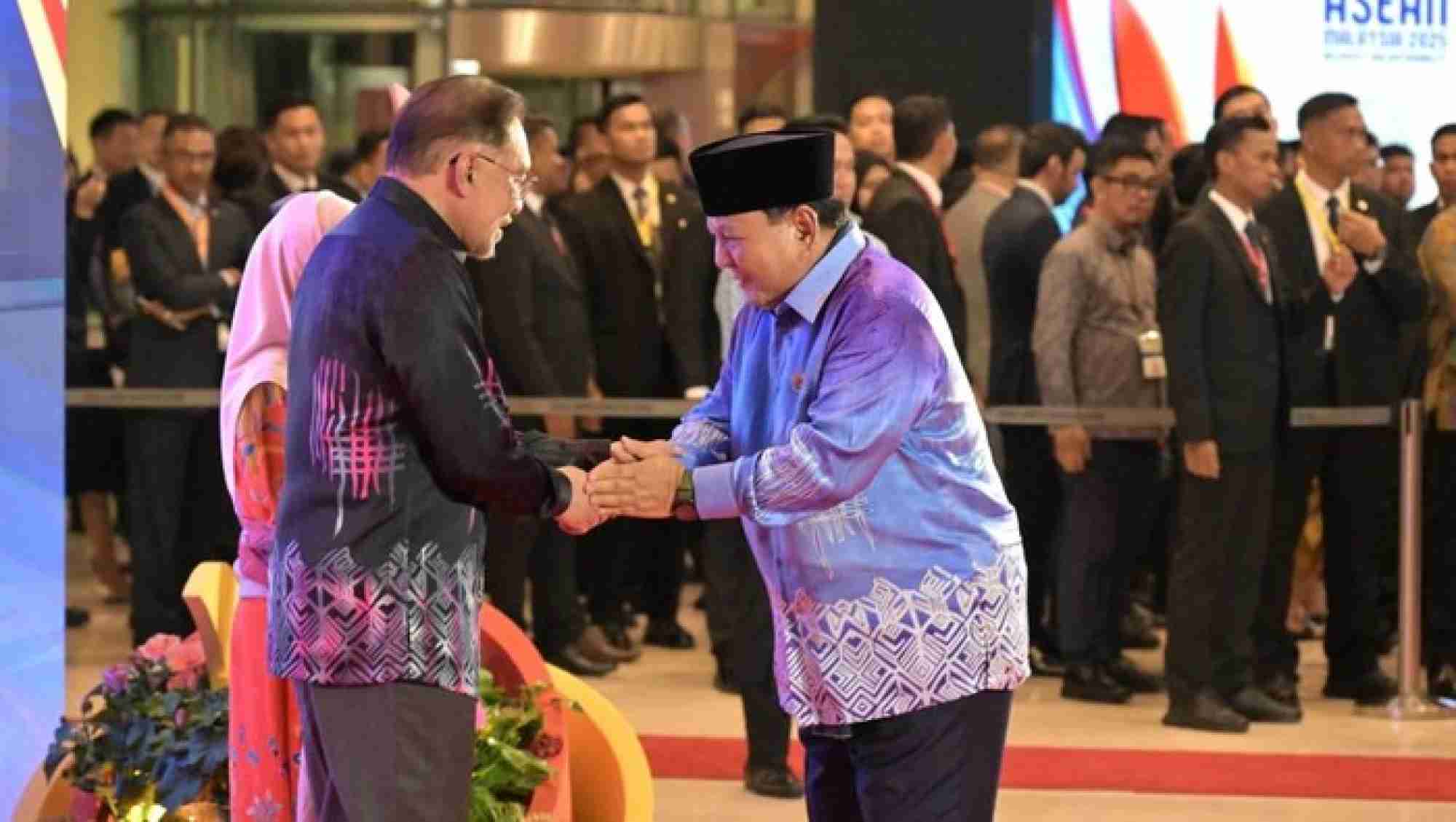 Presiden Prabowo Subianto menghadiri gala dinner dalam rangka Konferensi Tingkat Tinggi (KTT) ke-46 ASEAN yang diselenggarakan Perdana Menteri (PM) Malaysia Anwar Ibrahim. Prabowo mengenakan batik bernuansa biru dalam acara berlan...
